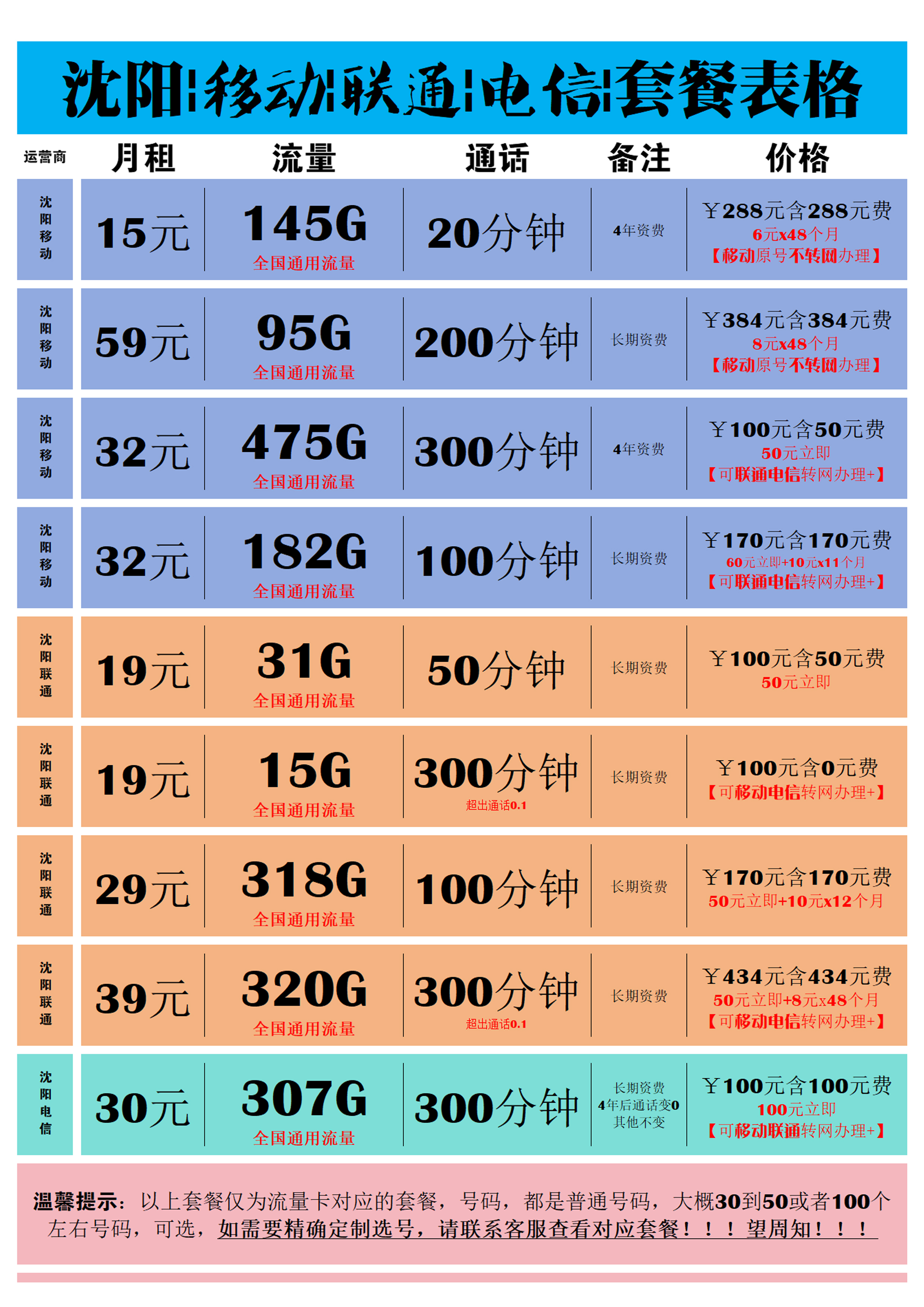 沈阳广电002:每月39/每月150G全国/每月150分钟(长期资费)【价格¥198含200(200=100+10x10)】【包年348约合29/月】